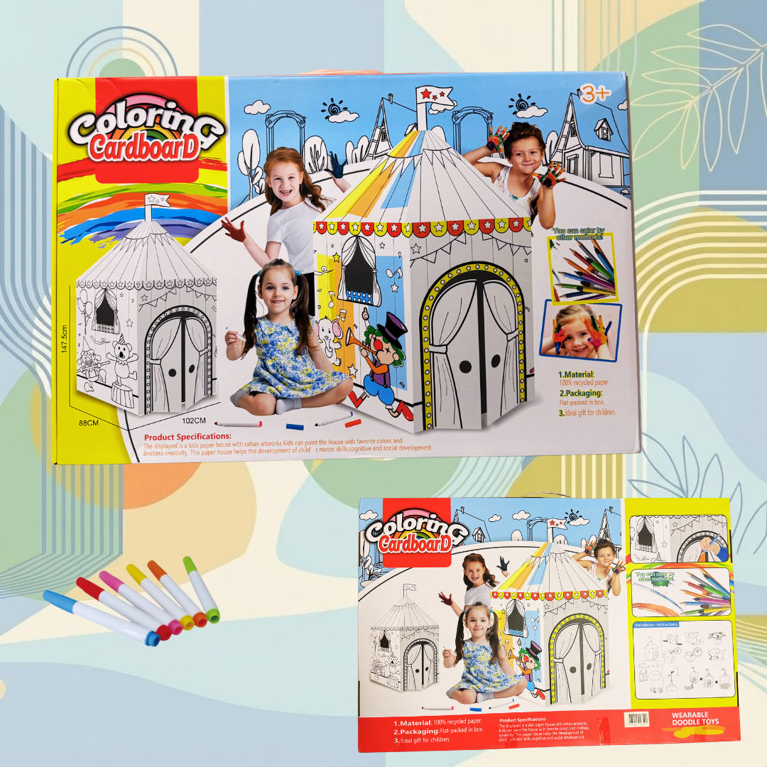 A gyerekek saját cirkuszi sátrukat színezhetik ki a mellékelt filctollakkal, majd játszóházként használhatják. Az óriási méretnek (102 × 88 × 148 cm) köszönhetően egyszerre több gyerek is elfér benne, így garantált a közös szórakozás.